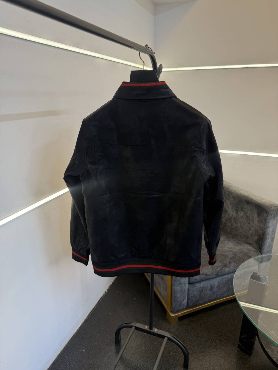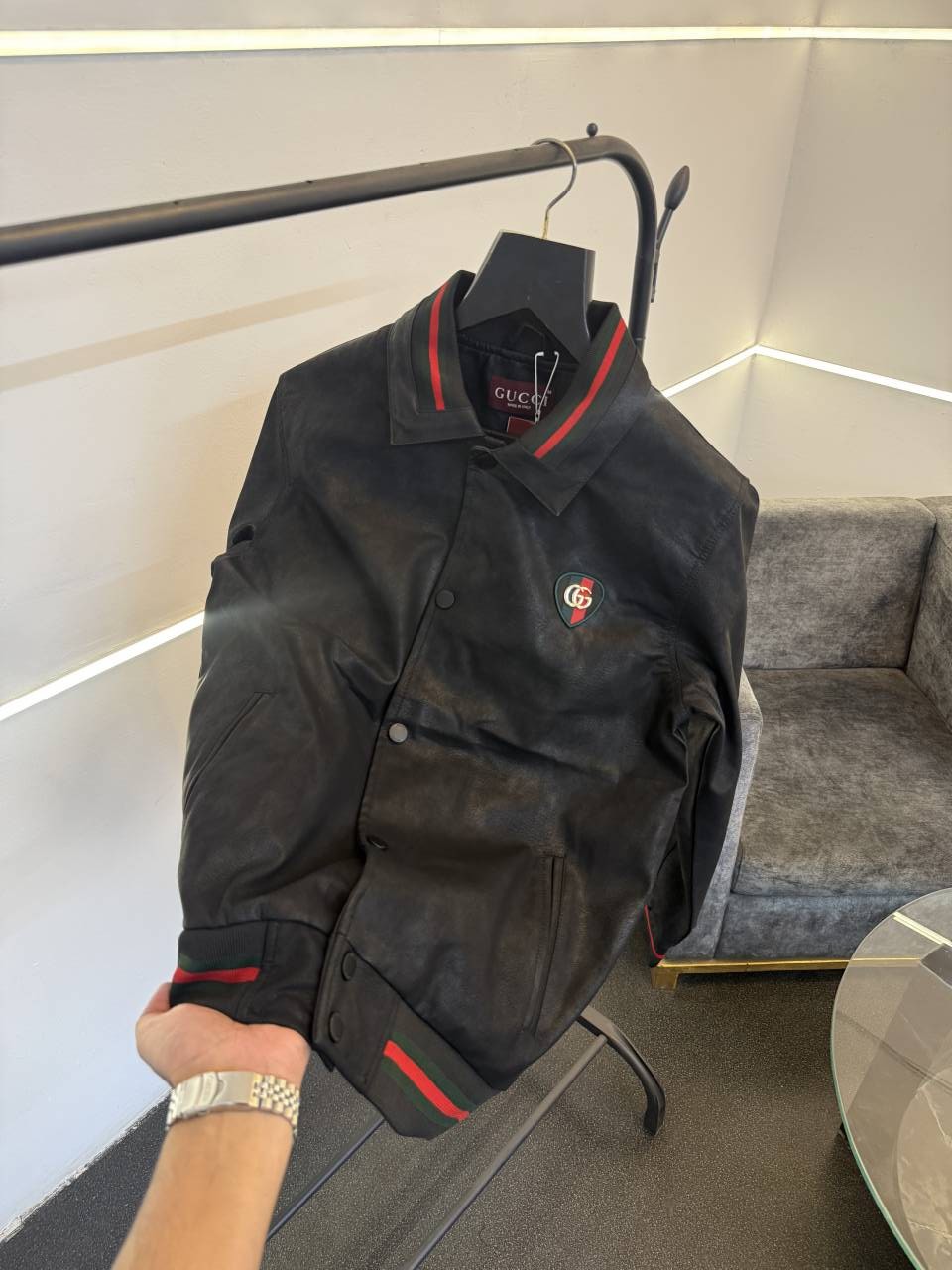 ? *Gucci imported front brand snap button imported varsity style leather jacket with brand zip and front pocket with inside pocket now in stock*?